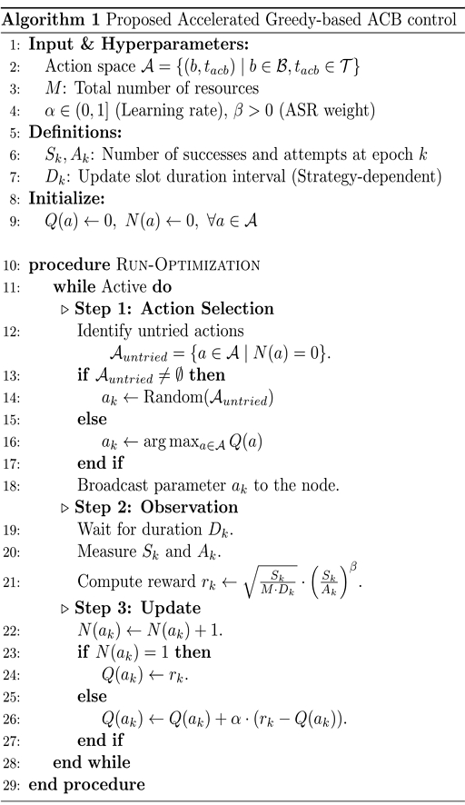 - 성능 검증: 시뮬레이션을 통해 제안된 전략들이 기존 LoRaWAN 및 고정형 ACB 대비 성능이 우수함을 검증하고, 각 업데이트 전략 간의 수렴성과 안정성 트레이드오프를 규명한다.